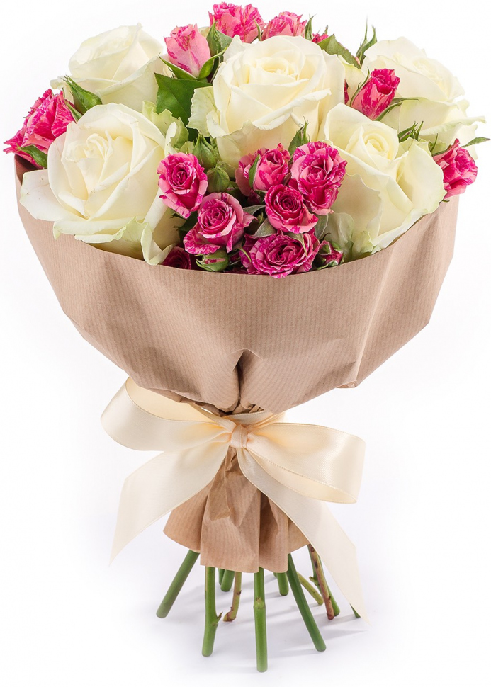 Восхитительный букет из ароматных розовых кустовых роз и нежнейших белых роз может стать замечательным презентом для ваших знакомых и близких людей. Букет прекрасно украсит любое торжество и праздник или станет великолепным подарком для вашей возлюбленной, дарящим радость, душевную теплоту и романтичность.